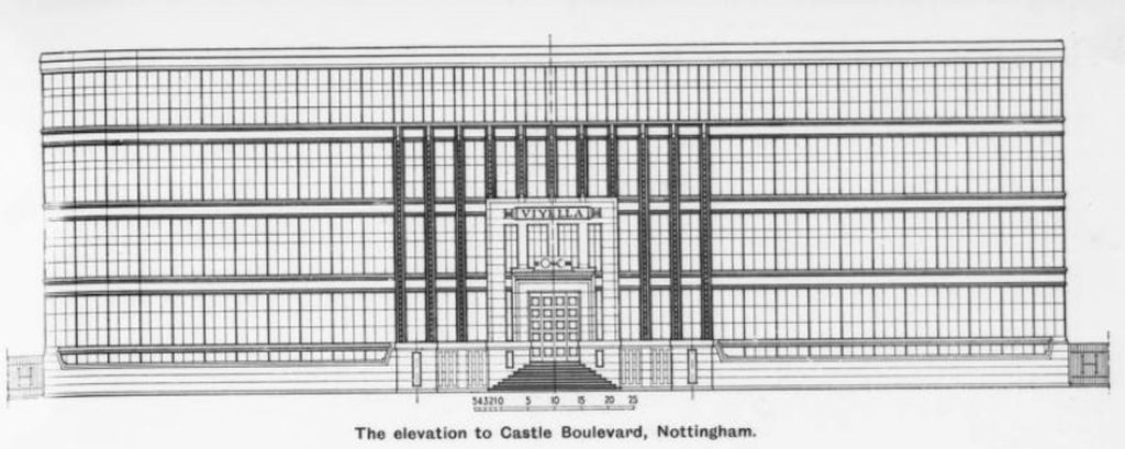 William Hollins & Co. with their trademarked Merino wool and cotton thread, Viyella (named for their original factory at Via Gellia in Derbyshire), expanded one of their Nottingham factories to become the company’s head office. Between 1931-1933, the new building by local architect Frank A. Broadhead was constructed on Castle Boulevard.