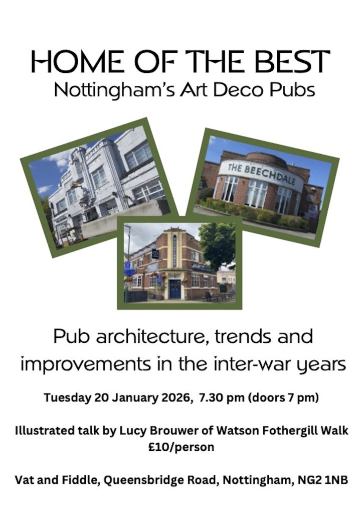 Nottingham’s Art Deco Pubs: Pub Architecture, Trends and Improvements in the Interwar Years, Tuesday 20 January 2026, Doors 7 pm. Tickets £10 each.
