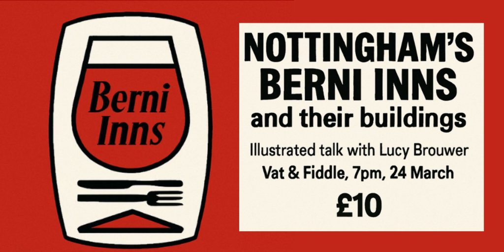 All this has inspired me to dig deeper into the history of Nottingham’s many Berni Inns and their buildings, and I will be presenting my findings at The Vat & Fiddle on Tuesday 24th March, 7pm. Tickets are £10.