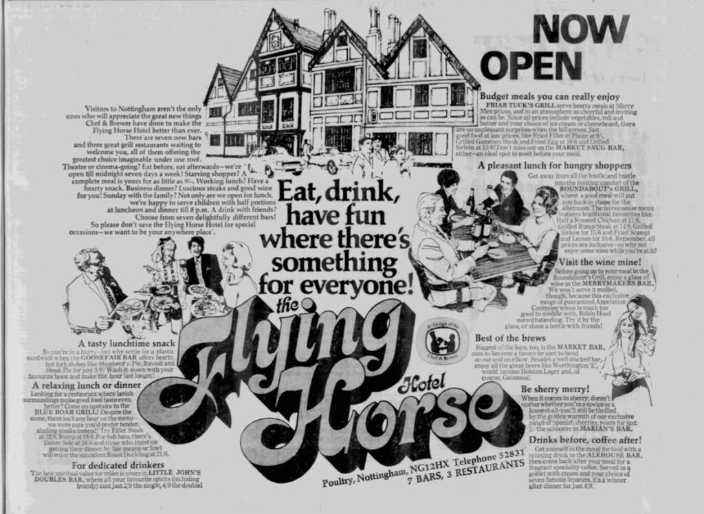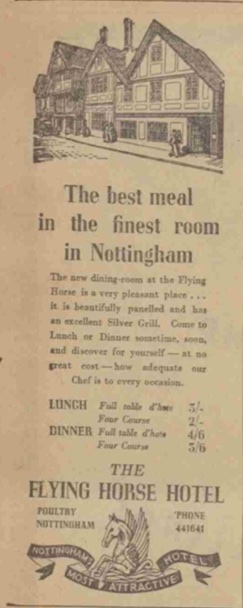 I have been delving deep into the stories of some old Nottingham buildings. One of these is the Flying Horse Hotel, which, for a short time, was owned and run by Berni Inns, but has been famed in the town and beyond in the years before and since.