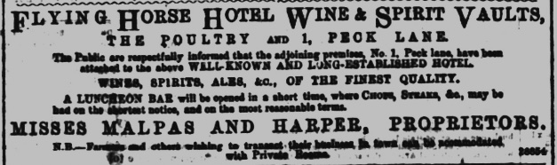 William Henry Malpas (1803-1862), along with his wife Jane (who he’d married in 1835), and later his sister Emma Susanna Malpas plus a staff of over a dozen barmaids, waiters, chambermaids, cooks, a carman and an under ostler, boots and under boots, ran the hotel until his death in 1862. Henry Malpas, as he was known to his friends, was a character seemingly straight from the pages of The Pickwick Papers (Charles Dickens’ debut novel, published in serial form from 1836). A colourful obituary in the Nottingham Journal describes him as “20 years mine host” at The Flying Horse, known for its “quaint and cosy style of architecture… one of those establishments where ‘men on the road’ and temporary sojourners might be supposed to have ‘taken their ease at the inn.’” The Flying Horse was known throughout the country and “held lordly sway over the lesser inns in Nottingham.” Malpas was a “robust and genial host”, always ready with a sporting story, his “force of character”, patriotism, love of field sports and greyhounds and acquaintance with “stars of the ring” including Nottingham’s boxing hero William “Bendigo” Thompson, making him a popular figure. Despite bankruptcy hearings due to his “having more than one iron in the fire” with his investments in iron and tin plate, he continued at the Flying Horse after the death of his wife and after attempts to sell the lease of the Hotel.
